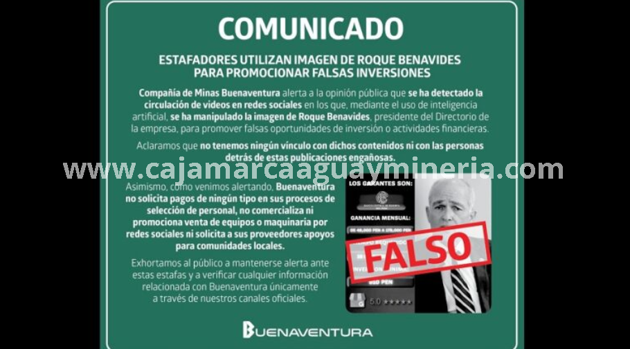 Compañía de Minas Buenaventura alerta a la opinión pública que se ha detectado la circulación de videos en redes sociales en los que, mediante el uso de inteligencia artificial, se ha manipulado la imagen de Roque Benavides, presidente del Directorio de la empresa, para promover falsas oportunidades de inversión o actividades financieras.