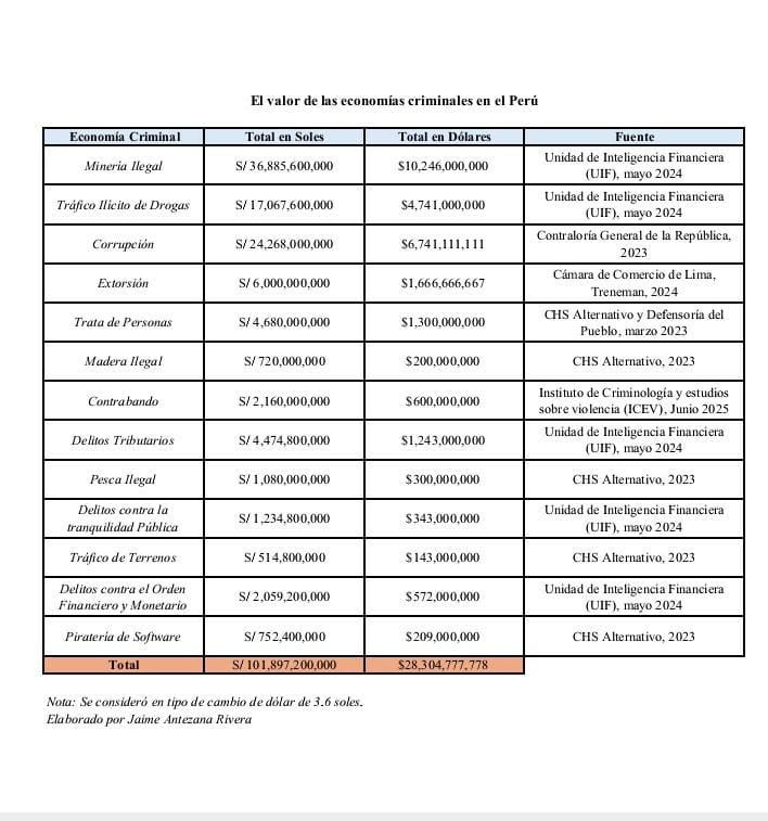 ¿Cuánto mueven las economías del crimen organizado en Perú? Más de 28 mil millones de dólares y, en moneda nacional, más de 101 mil millones de soles. Las fuentes utilizadas son oficiales y estudios de instituciones reconocidas. No son cifras inventadas por el autor.